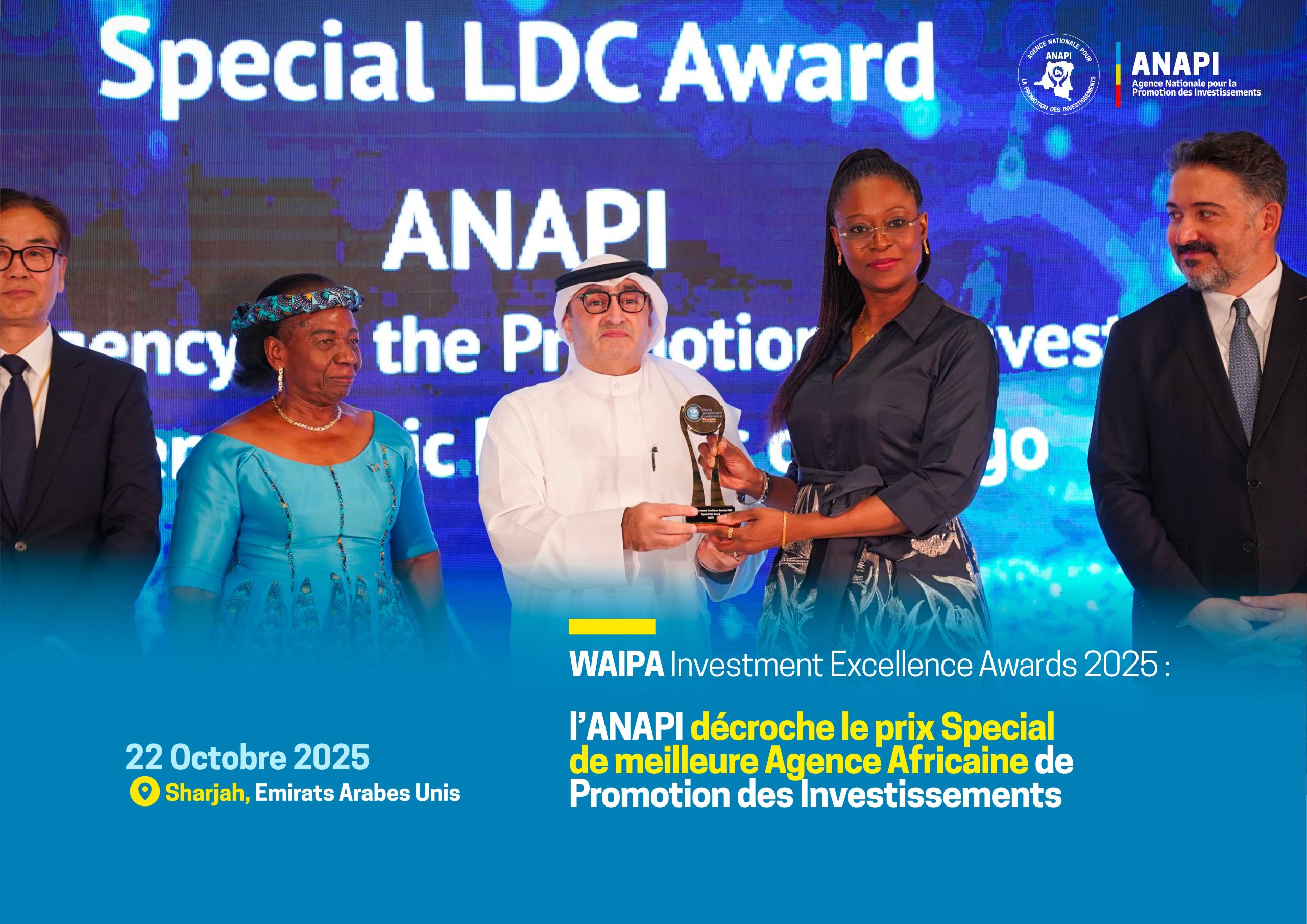 Grâce à ses innovations numériques, son accompagnement stratégique et son plaidoyer en faveur d’un climat des affaires attractif, l’Agence Nationale pour la Promotion des Investissements (ANAPI) de la République Démocratique du Congo s’est distinguée aux WAIPA Investment Excellence Awards 2025, en décrochant ce mercredi 22 octobre 2025, aux Emirats Arabes Unis, le Prix Spécial de distinction honorifique de meilleure Agence Africaine de Promotion des Investissements.